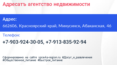 Адресатъ, агентство недвижимости по адресу 662606, Красноярский край, Минусинск, Абаканская, 46 в дальнейшем Организация, размещена в следующих категориях: