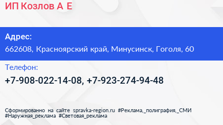 ИП Козлов А.Е. по адресу 662608, Красноярский край, Минусинск, Гоголя, 60 в дальнейшем Организация, размещена в следующих категориях: