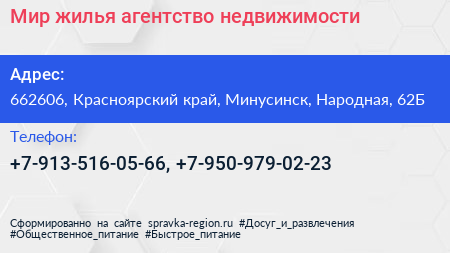 Мир жилья, агентство недвижимости по адресу 662606, Красноярский край, Минусинск, Народная, 62Б в дальнейшем Организация, размещена в следующих категориях: