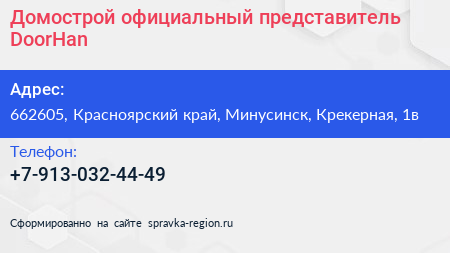 Домострой, официальный представитель DoorHan по адресу 662605, Красноярский край, Минусинск, Крекерная, 1в в дальнейшем Организация, размещена в следующих категориях: