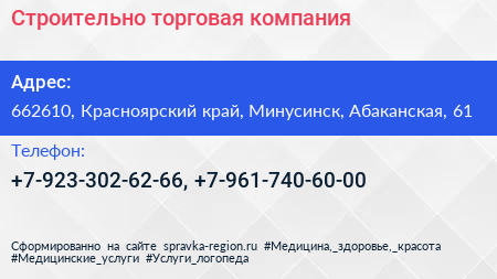 Строительно-торговая компания по адресу 662610, Красноярский край, Минусинск, Абаканская, 61 в дальнейшем Организация, размещена в следующих категориях: