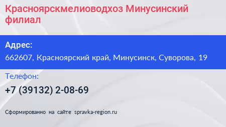 Красноярскмелиоводхоз, Минусинский филиал по адресу 662607, Красноярский край, Минусинск, Суворова, 19 в дальнейшем Организация, размещена в следующих категориях: