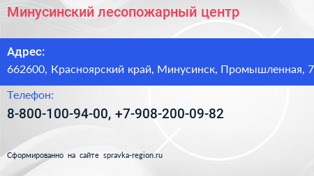 Минусинский лесопожарный центр по адресу 662600, Красноярский край, Минусинск, Промышленная, 7 в дальнейшем Организация, размещена в следующих категориях: