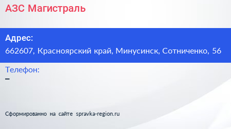 АЗС Магистраль по адресу 662607, Красноярский край, Минусинск, Сотниченко, 56 в дальнейшем Организация, размещена в следующих категориях:
