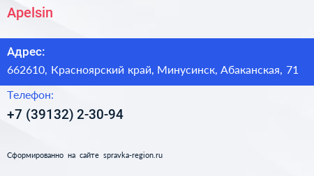 Apelsin по адресу 662610, Красноярский край, Минусинск, Абаканская, 71 в дальнейшем Организация, размещена в следующих категориях: