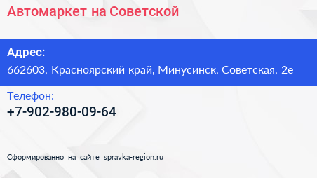 Автомаркет на Советской по адресу 662603, Красноярский край, Минусинск, Советская, 2е в дальнейшем Организация, размещена в следующих категориях: