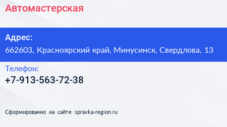 Автомастерская по адресу 662603, Красноярский край, Минусинск, Свердлова, 13 в дальнейшем Организация, размещена в следующих категориях: