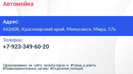 Автомойка по адресу 662608, Красноярский край, Минусинск, Мира, 57а в дальнейшем Организация, размещена в следующих категориях: