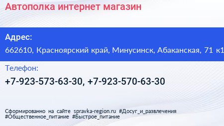 Автополка, интернет-магазин по адресу 662610, Красноярский край, Минусинск, Абаканская, 71 к1 в дальнейшем Организация, размещена в следующих категориях: