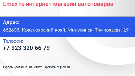Emex.ru, интернет-магазин автотоваров по адресу 662603, Красноярский край, Минусинск, Тимирязева, 19 в дальнейшем Организация, размещена в следующих категориях: