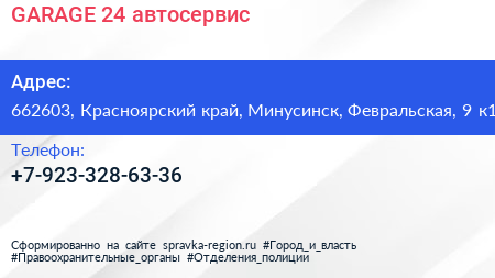 GARAGE 24, автосервис по адресу 662603, Красноярский край, Минусинск, Февральская, 9 к1 в дальнейшем Организация, размещена в следующих категориях: