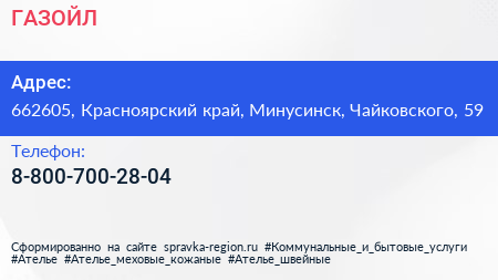 ГАЗОЙЛ по адресу 662605, Красноярский край, Минусинск, Чайковского, 59 в дальнейшем Организация, размещена в следующих категориях: