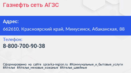 Газнефть, сеть АГЗС по адресу 662610, Красноярский край, Минусинск, Абаканская, 88 в дальнейшем Организация, размещена в следующих категориях: