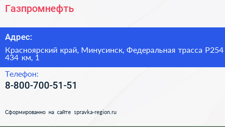 Газпромнефть по адресу Красноярский край, Минусинск, Федеральная трасса Р254 434 км, 1 в дальнейшем Организация, размещена в следующих категориях: