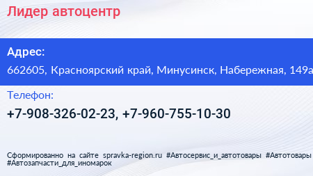 Лидер, автоцентр по адресу 662605, Красноярский край, Минусинск, Набережная, 149а в дальнейшем Организация, размещена в следующих категориях: