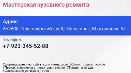 Мастерская кузовного ремонта по адресу 662608, Красноярский край, Минусинск, Мартьянова, 54 в дальнейшем Организация, размещена в следующих категориях: