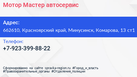 Мотор Мастер, автосервис по адресу 662610, Красноярский край, Минусинск, Комарова, 13 ст1 в дальнейшем Организация, размещена в следующих категориях: