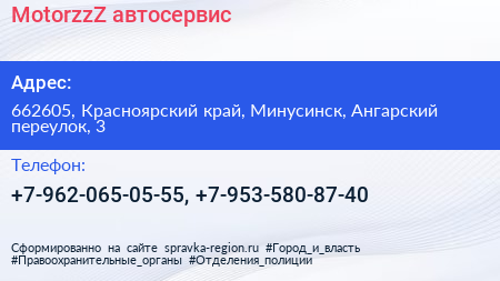 MotorzzZ, автосервис по адресу 662605, Красноярский край, Минусинск, Ангарский переулок, 3 в дальнейшем Организация, размещена в следующих категориях: