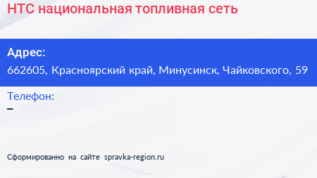 НТС, национальная топливная сеть по адресу 662605, Красноярский край, Минусинск, Чайковского, 59 в дальнейшем Организация, размещена в следующих категориях: