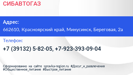 СИБАВТОГАЗ по адресу 662610, Красноярский край, Минусинск, Береговая, 2а в дальнейшем Организация, размещена в следующих категориях: