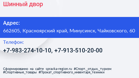 Шинный двор по адресу 662605, Красноярский край, Минусинск, Чайковского, 60 в дальнейшем Организация, размещена в следующих категориях: