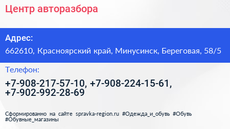 Центр авторазбора по адресу 662610, Красноярский край, Минусинск, Береговая, 58/5 в дальнейшем Организация, размещена в следующих категориях: