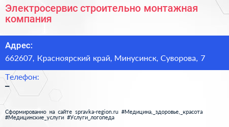 Электросервис, строительно-монтажная компания по адресу 662607, Красноярский край, Минусинск, Суворова, 7 в дальнейшем Организация, размещена в следующих категориях: