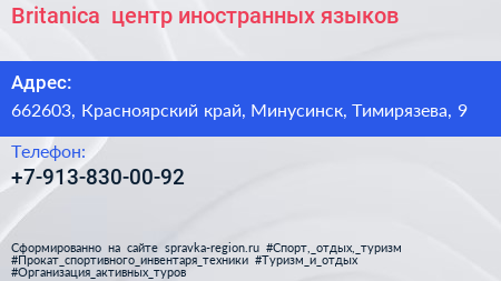 Britanica+, центр иностранных языков по адресу 662603, Красноярский край, Минусинск, Тимирязева, 9 в дальнейшем Организация, размещена в следующих категориях: