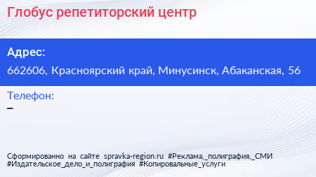 Глобус, репетиторский центр по адресу 662606, Красноярский край, Минусинск, Абаканская, 56 в дальнейшем Организация, размещена в следующих категориях: