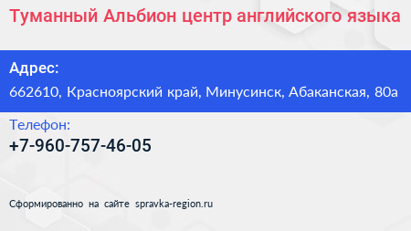 Туманный Альбион, центр английского языка по адресу 662610, Красноярский край, Минусинск, Абаканская, 80а в дальнейшем Организация, размещена в следующих категориях: