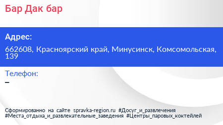 Бар-Дак, бар по адресу 662608, Красноярский край, Минусинск, Комсомольская, 139 в дальнейшем Организация, размещена в следующих категориях: