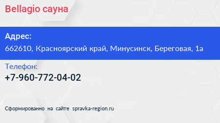 Bellagio, сауна по адресу 662610, Красноярский край, Минусинск, Береговая, 1а в дальнейшем Организация, размещена в следующих категориях: