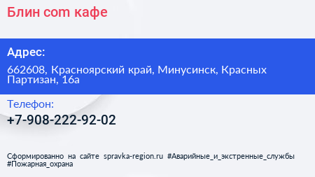 Блин.com, кафе по адресу 662608, Красноярский край, Минусинск, Красных Партизан, 16а в дальнейшем Организация, размещена в следующих категориях: