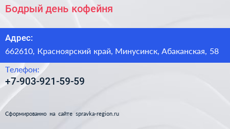 Бодрый день, кофейня по адресу 662610, Красноярский край, Минусинск, Абаканская, 58 в дальнейшем Организация, размещена в следующих категориях: