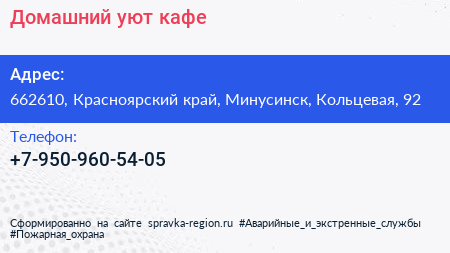 Домашний уют, кафе по адресу 662610, Красноярский край, Минусинск, Кольцевая, 92 в дальнейшем Организация, размещена в следующих категориях: