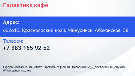 Галактика, кафе по адресу 662610, Красноярский край, Минусинск, Абаканская, 58 в дальнейшем Организация, размещена в следующих категориях: