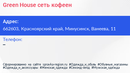 Green House, сеть кофеен по адресу 662603, Красноярский край, Минусинск, Ванеева, 11 в дальнейшем Организация, размещена в следующих категориях: