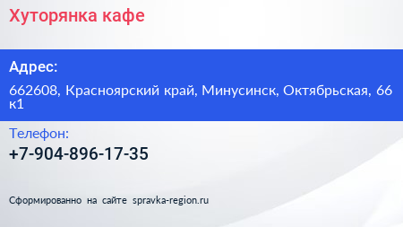 Хуторянка, кафе по адресу 662608, Красноярский край, Минусинск, Октябрьская, 66 к1 в дальнейшем Организация, размещена в следующих категориях: