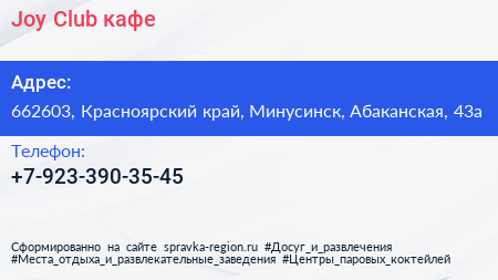 Joy Club, кафе по адресу 662603, Красноярский край, Минусинск, Абаканская, 43а в дальнейшем Организация, размещена в следующих категориях: