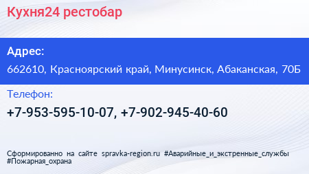 Кухня24, рестобар по адресу 662610, Красноярский край, Минусинск, Абаканская, 70Б в дальнейшем Организация, размещена в следующих категориях:
