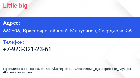 Little big по адресу 662606, Красноярский край, Минусинск, Свердлова, 36 в дальнейшем Организация, размещена в следующих категориях: