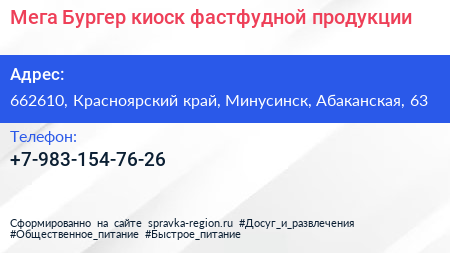 Мега Бургер, киоск фастфудной продукции по адресу 662610, Красноярский край, Минусинск, Абаканская, 63 в дальнейшем Организация, размещена в следующих категориях: