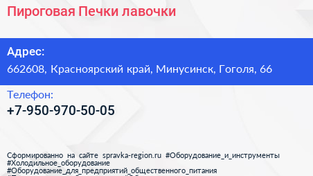 Пироговая Печки-лавочки по адресу 662608, Красноярский край, Минусинск, Гоголя, 66 в дальнейшем Организация, размещена в следующих категориях: