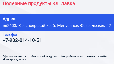 Полезные продукты-ЮГ, лавка по адресу 662603, Красноярский край, Минусинск, Февральская, 22 в дальнейшем Организация, размещена в следующих категориях: