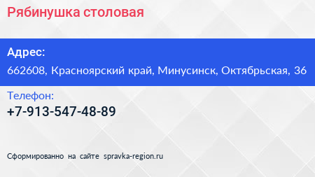 Рябинушка, столовая по адресу 662608, Красноярский край, Минусинск, Октябрьская, 36 в дальнейшем Организация, размещена в следующих категориях: