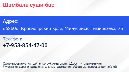 Шамбала, суши-бар по адресу 662606, Красноярский край, Минусинск, Тимирязева, 7Б в дальнейшем Организация, размещена в следующих категориях: