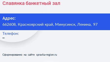 Славянка, банкетный зал по адресу 662608, Красноярский край, Минусинск, Ленина, 97 в дальнейшем Организация, размещена в следующих категориях: