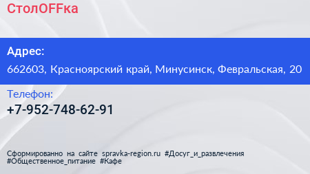 СтолOFFка по адресу 662603, Красноярский край, Минусинск, Февральская, 20 в дальнейшем Организация, размещена в следующих категориях: