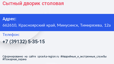 Сытный дворик, столовая по адресу 662610, Красноярский край, Минусинск, Тимирязева, 12а в дальнейшем Организация, размещена в следующих категориях: