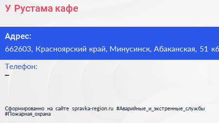 У Рустама, кафе по адресу 662603, Красноярский край, Минусинск, Абаканская, 51 к6 в дальнейшем Организация, размещена в следующих категориях: